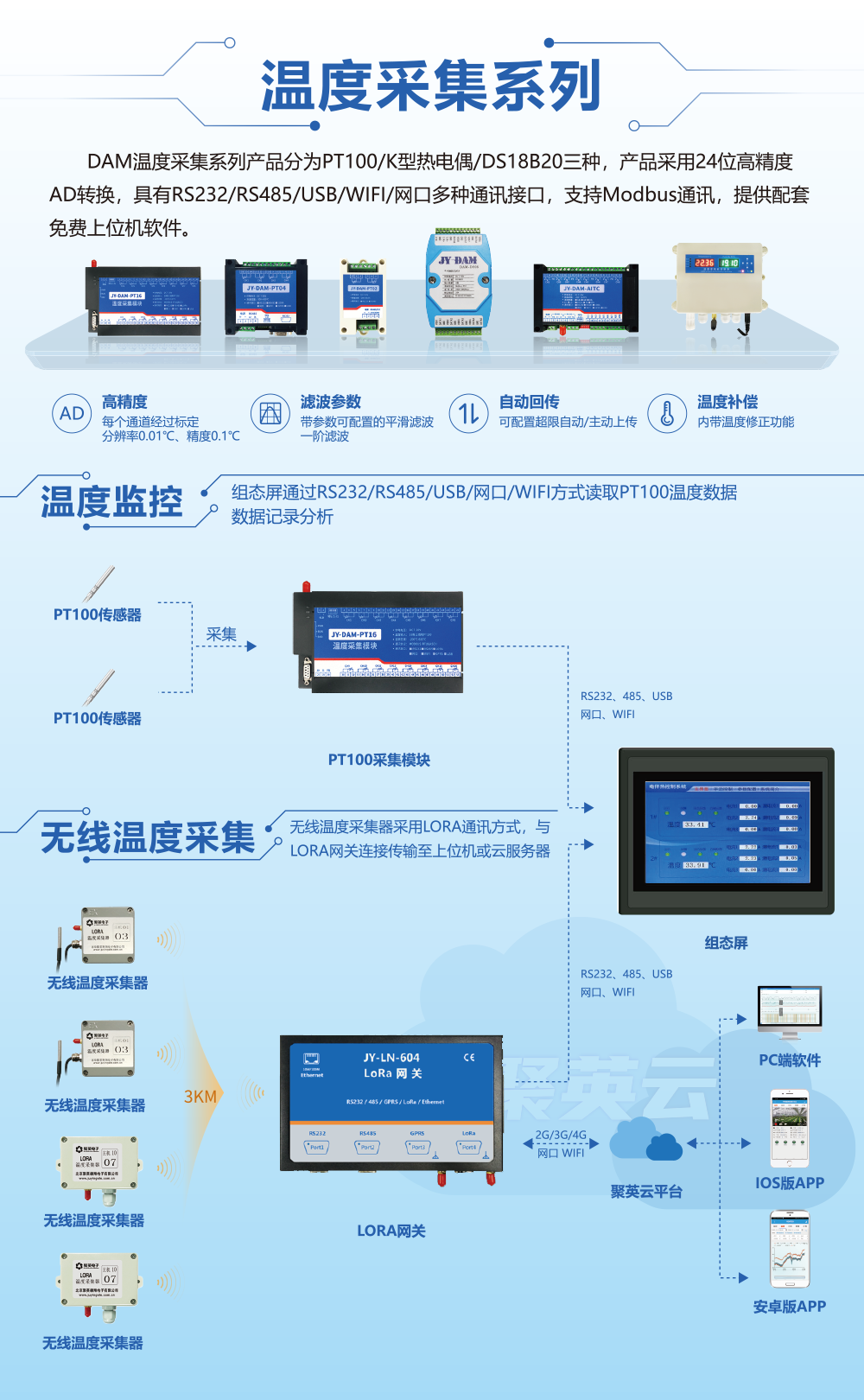 DAM溫度采集系列產品分為PT100/K型熱電偶/DS18B20三種,產品采用24位高精度AD轉換,具有RS232/RS485/USB/WIFI/網口多種通訊接口,支持Modbus通訊,提供配套免費上位機軟件。