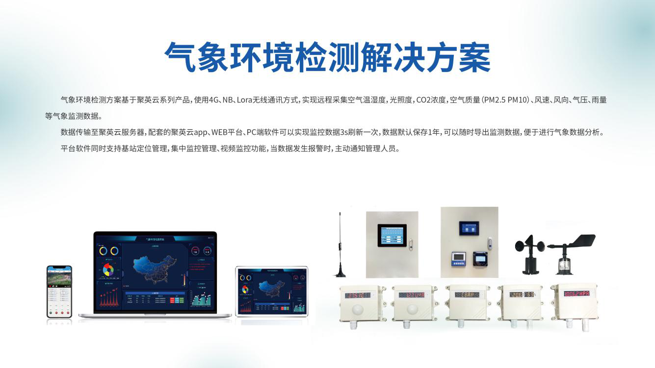 氣象環境檢測方案基于聚英云系列產品,使用4G、NB.Lora無線通訊方式,實現遠程采集空氣溫濕度,光照度,CO2濃度,空氣質量(PM2.5 PM10)、風速、風向、氣壓、雨量等氣象監測數據。