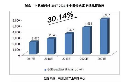 綜合以上因素,我們預計,2017年中國傳感器市場規模將達到2,070億元,未來五年(2017-2021)行業年均復合增長率約為30.14%,2021年中國傳感器市場規模將達到5,937億元。