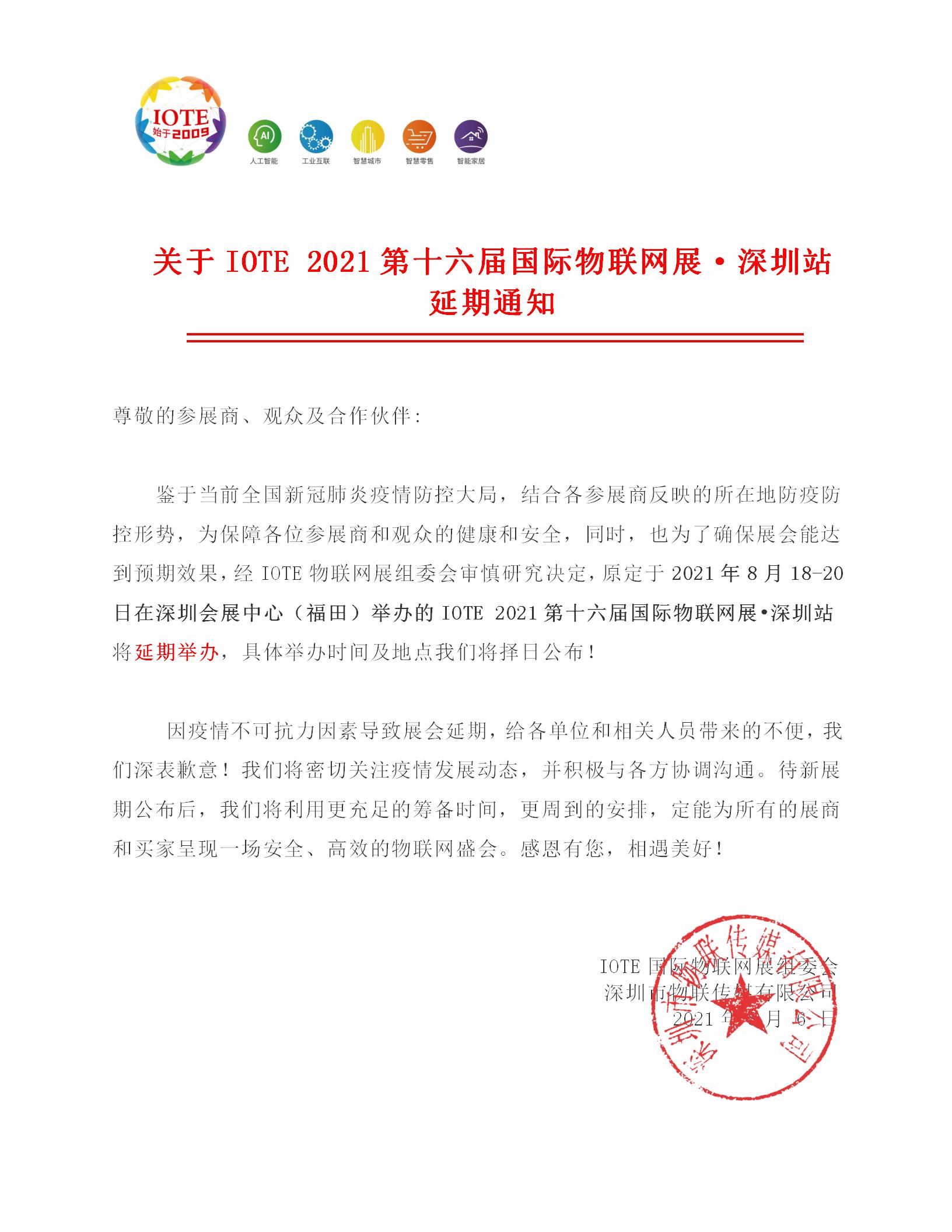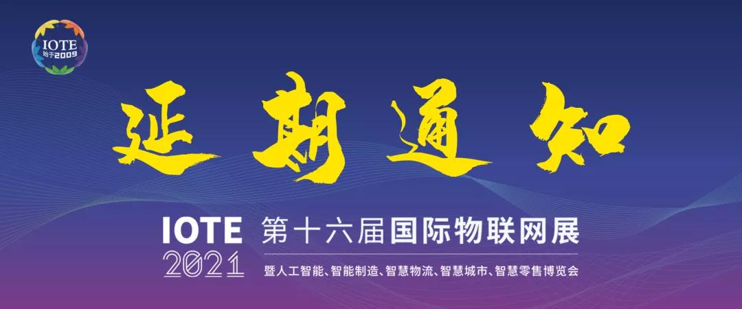 鑒于當前全國新冠肺炎疫情防控大局,結合各參展商反映的所在地防疫防控形勢,為保障各位參展商和觀眾的健康和安全,同時,也為了確保展會能達到預期效果,經IOTE物聯網展組委會審慎研究決定,原定于2021年8月18-20日在深圳會展中心(福田)舉辦的IOTE 2021第十六屆國際物聯網展•深圳站將延期舉辦,具體舉辦時間及地點我們將擇日公布!