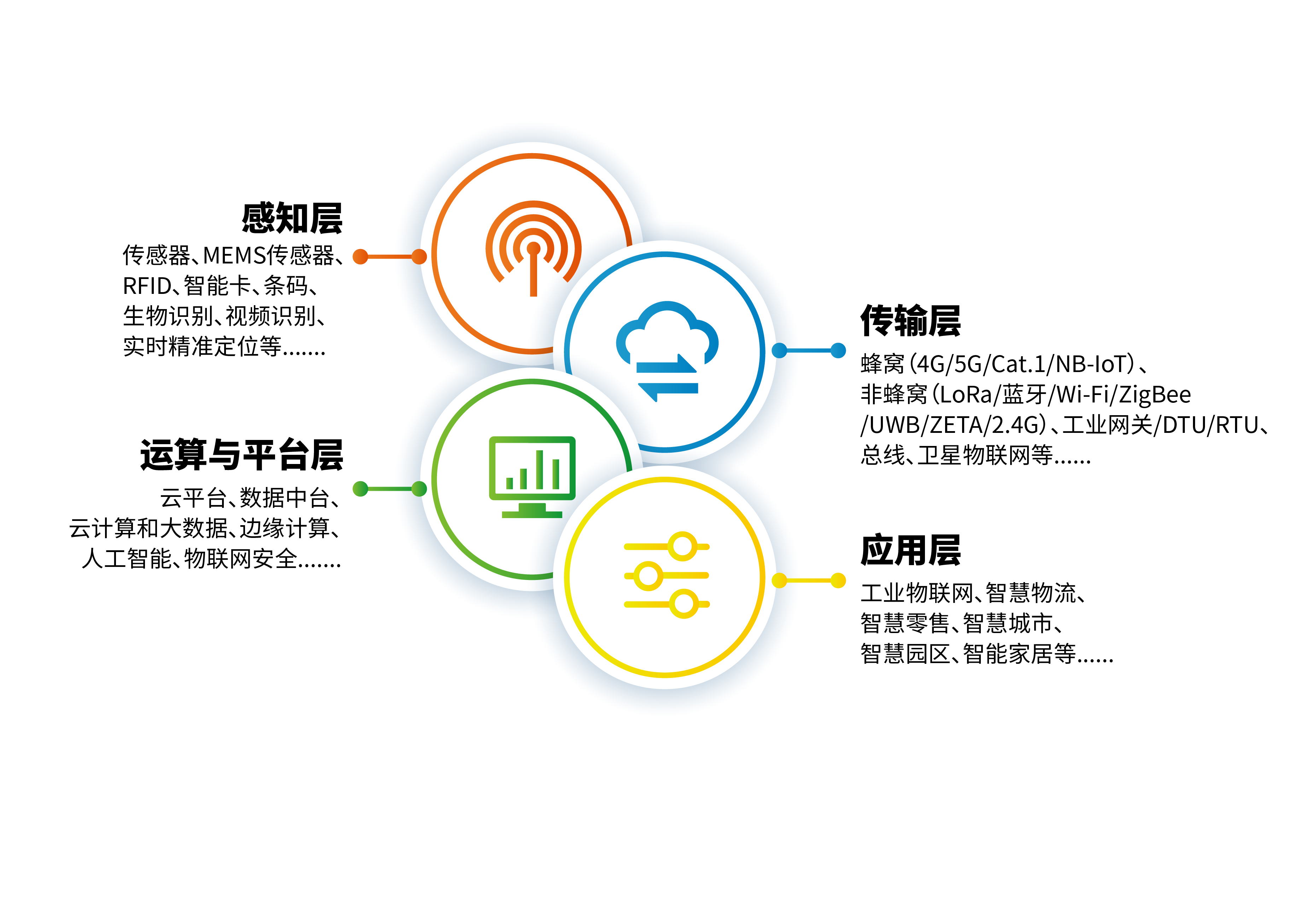 網絡傳輸層(蜂窩(4G/5G/Cat.1/NB-IoT)、非蜂窩(LoRa/藍牙/Wi-Fi/ZigBee/UWB/ZETA/2.4G)、工業網關/DTU/RTU、總線、衛星物聯網等)
