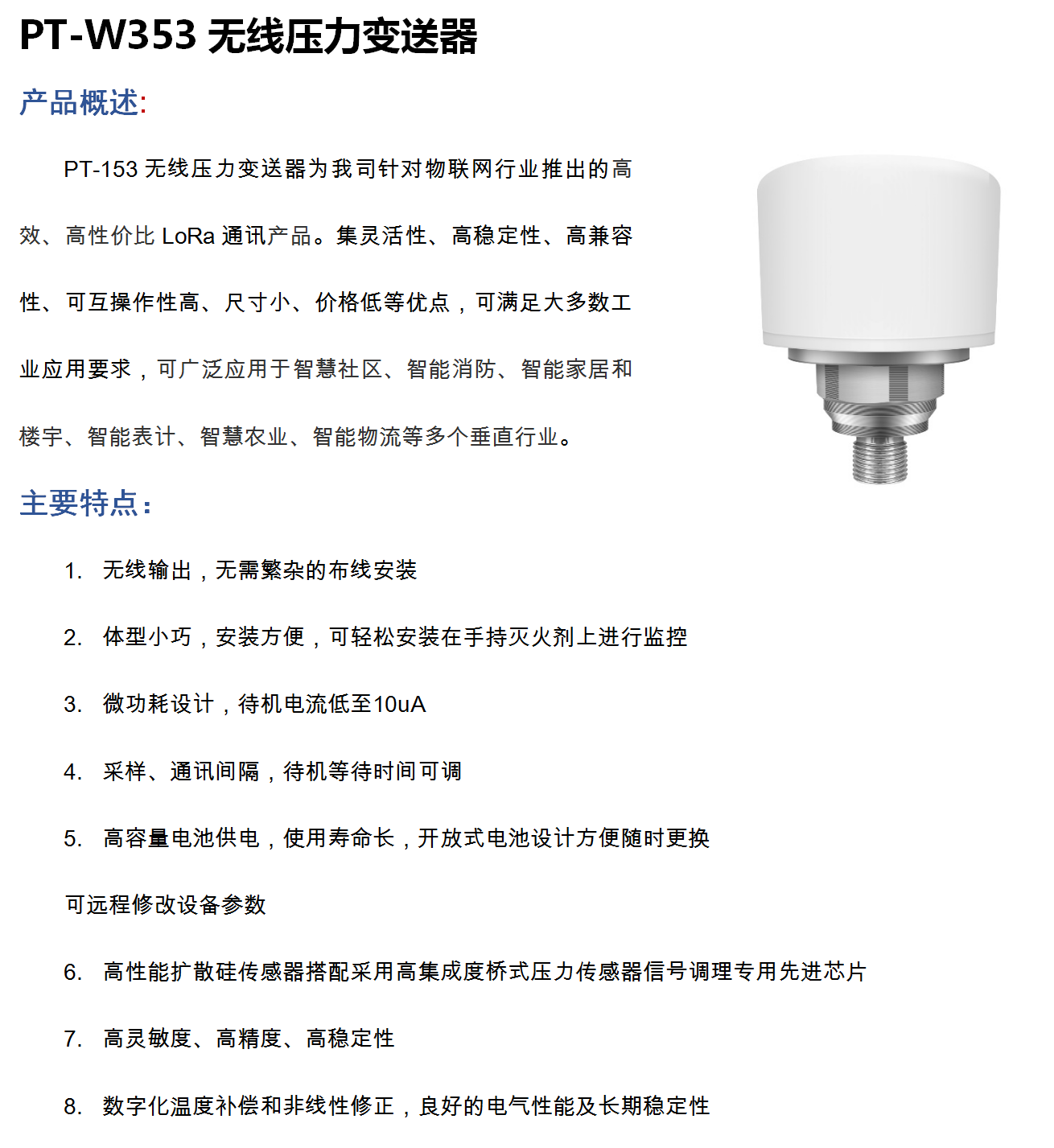 無線產品系列是根據客戶安裝便捷需求而研發的一款超低功耗電池供電的無線壓力變送器。擁有高容量電池38000mAh,發送數據超過5萬次。具備采集時間、發送頻率可調,支持數據儲存,異常數據主動上傳。支持2位報警點可設,支持NB-IOT/ GPRS /LORAWAN / ZigBee 等多種通訊協議。安裝使用方便。可廣泛應用于水、油、氣等壓力自動化測量和監控網絡系統。